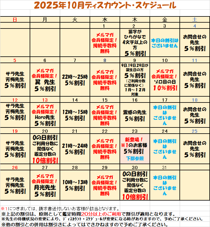 | お誕生日該当月に鑑定された方 | 500円 | 発生いたします。 |