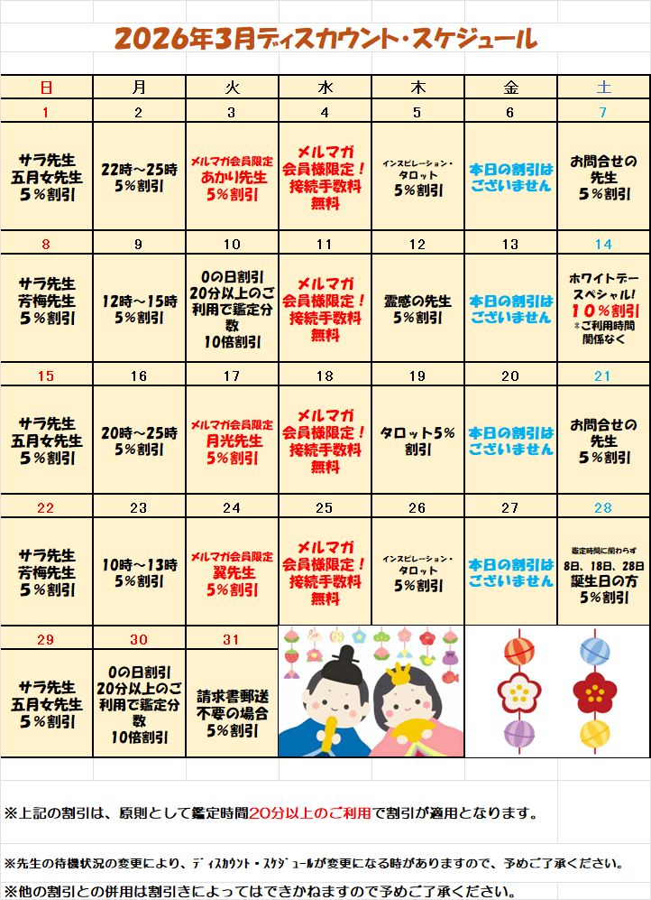 | お誕生日該当月に鑑定された方 | 500円 | 発生いたします。 |